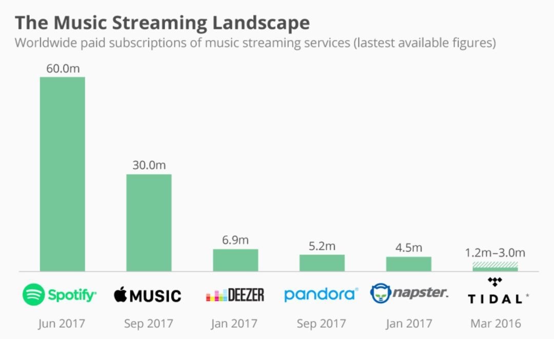 Spotify是全球最大的音乐流媒体企业,业务已扩展到60多个国家,遥遥领先苹果、亚马逊、谷歌、Pandora等竞争对手。