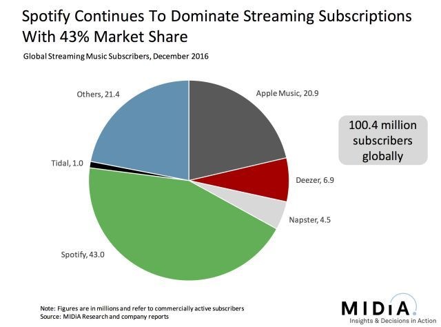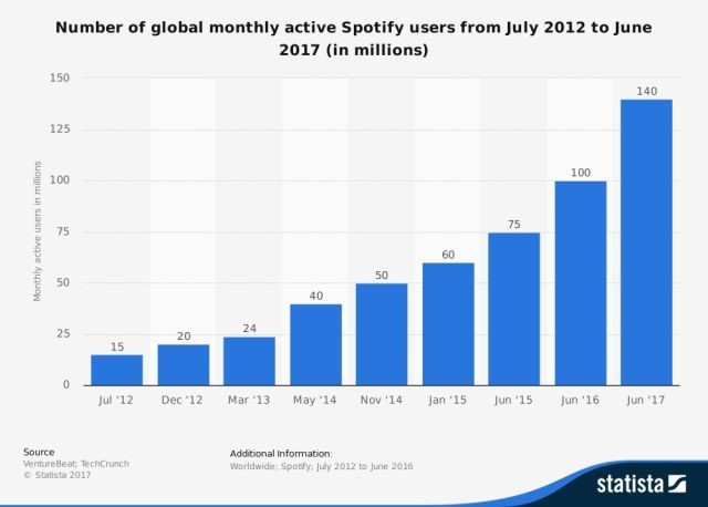 据公司官方数据,截至2017年12月31日,付费用户数量为7100万,月活跃用户数为1.59亿。而竞争对手Apple Music则只有约3600万付费订阅用户。