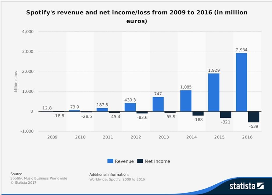 2017年,Spotify一共亏损了15亿美元,其中约 12 亿美元与融资交易价值的变化有关。
