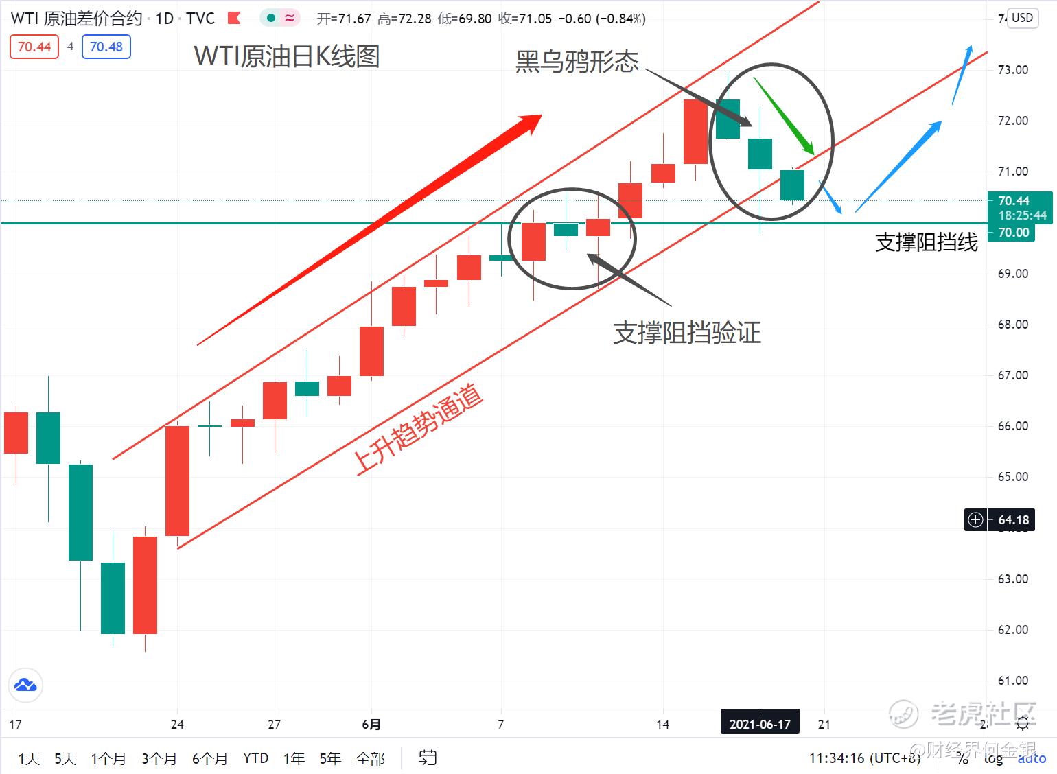 另外我们可以看下原油的日线图,70点位的支撑阻挡验证同样具有意义,我个人更偏向与原油是回调,毕竟如今的基本面确实是利多原油的,当然还是要以盘面为准,我们需要基本面与技术面互相验证才更有效。