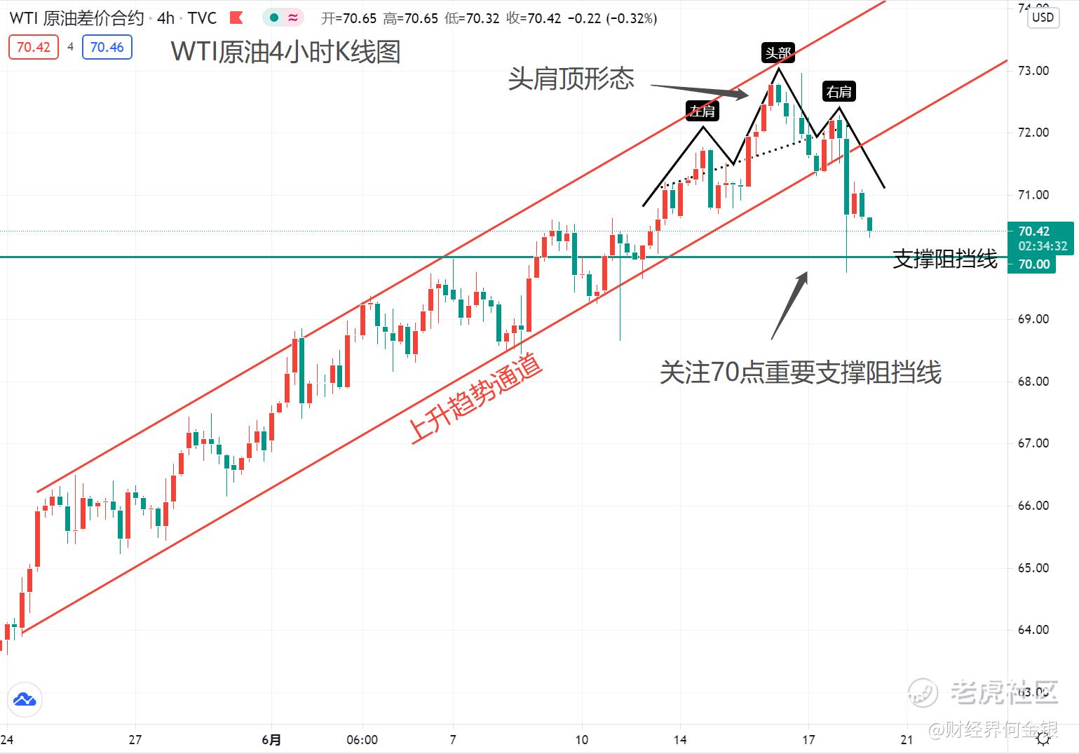 我们回到盘面来看,从原油的4小时K线图上可以看出目前原油已经跌破原来的上升通道,因此目前不适合多单再进场,毕竟下载下跌行情并未停止,而顶部的头肩顶形态也是一个明显的顶部反转形态,所以在70点的支撑阻挡线就显得尤为重要。若原油跌破70点且收盘于下方,那说明原油还要向下走。