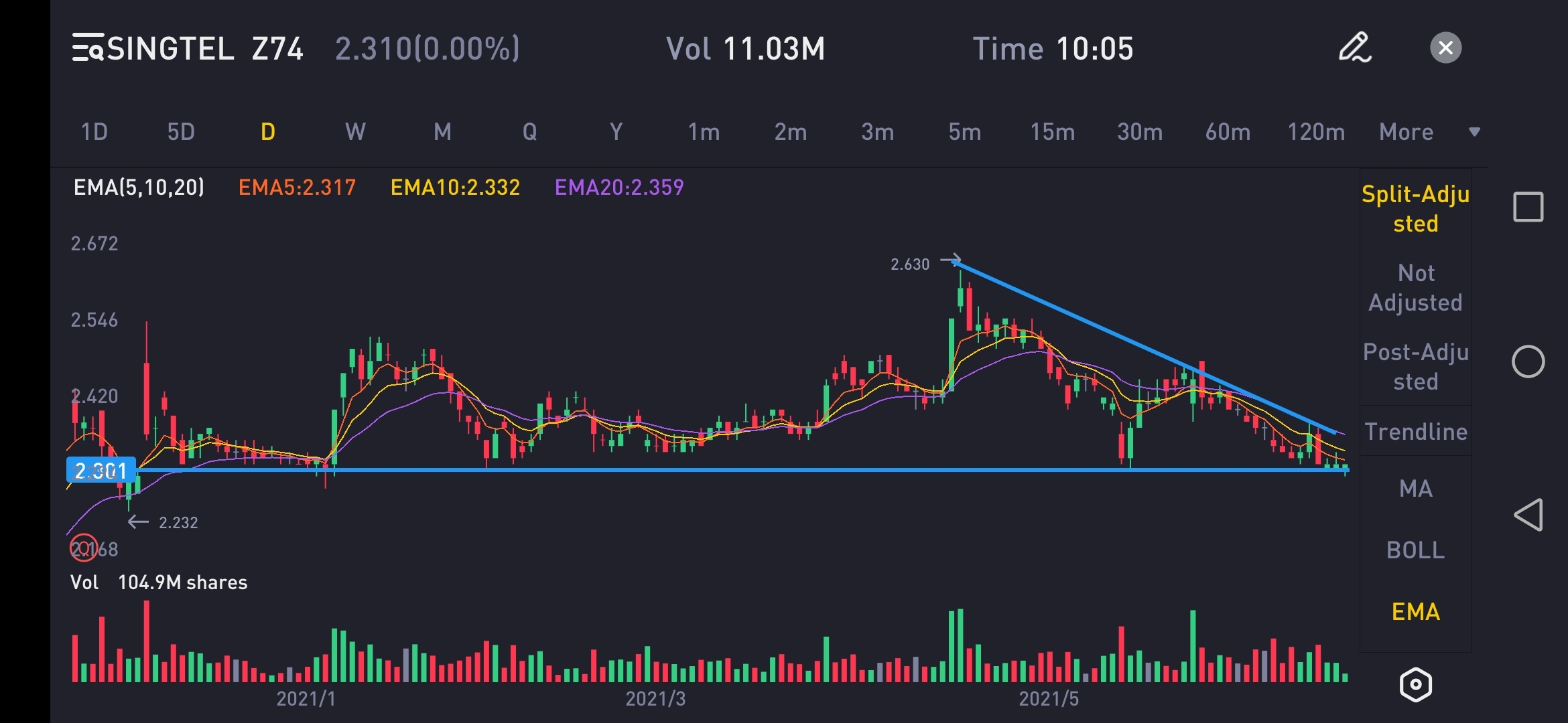 $SINGTEL(Z74.SI)$ is at a critical support level. 2.30 support must hold, failing which, we may see a new round of selling to 2.15 level. Intraday bid ask volume is turning bearish as bid queue is dropping while ask queue is building up.