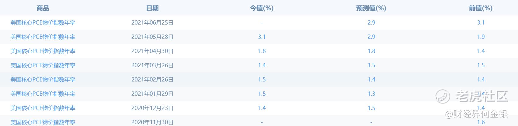 至于美联储最看重的指标—核心个人消费支出通胀(PCE),这次的FOMC声明也显示,2021年、2022年和2023年的核心PCE通胀预期中值分别为3%、2.1%、2.1%,而这组数据在3月的预期分别为2.2%、2%、2.1%。