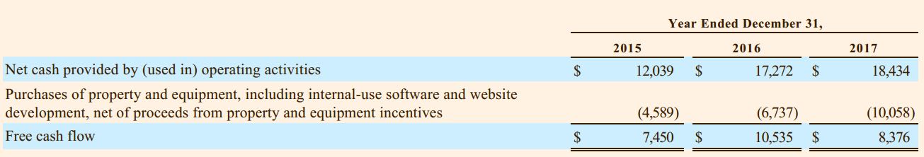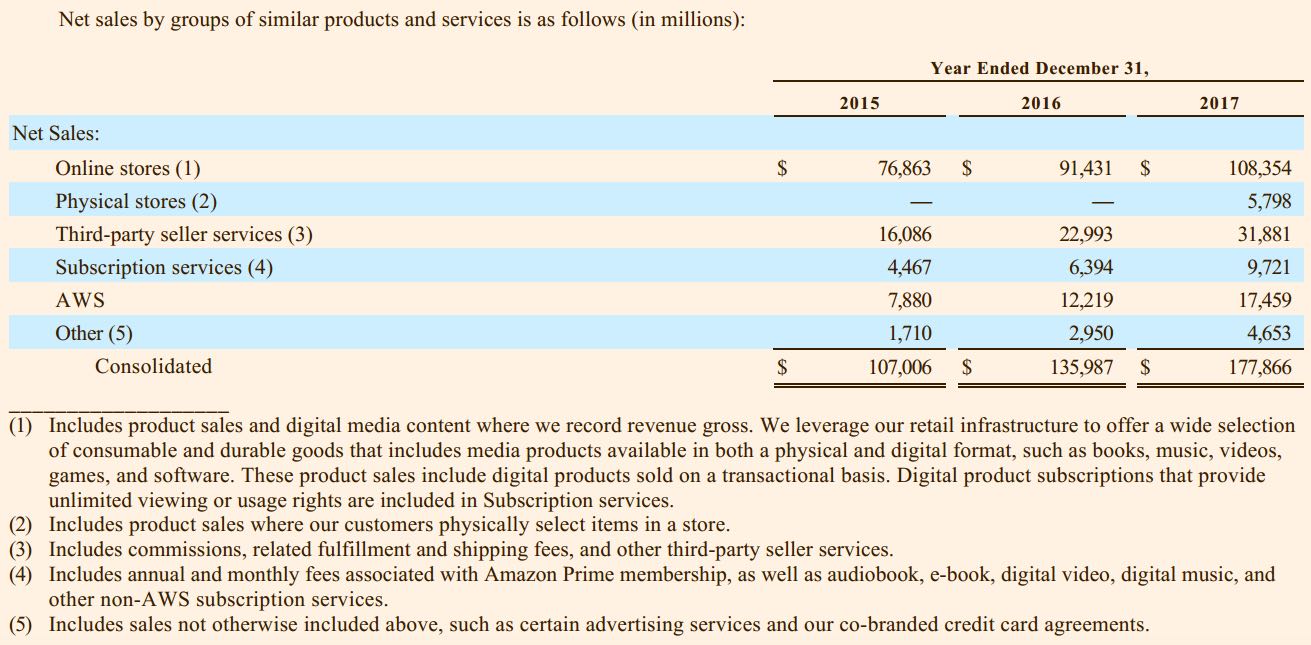 1. 现有的零售业务:线上收入1100亿美金左右,并保持20%左右的年增长;第三方卖家服务当前有320亿美金左右收入,并保持40%左右年增长率;Prime会员预定服务接近100亿美金收入,并保持50%左右年增长率;同时,2017年收购了全食超市,合并了58亿美金的销售收入,同时线上线下一体化,给未来的零售业务带来了巨大的想象空间,特别是Amazon go,可能会颠覆未来的整个的零售行业。所以,零售行业未来的会加速成长,并且随着第三方卖家服务和Prime会员服务的规模增长,会带来大量的自由现金流和利润。