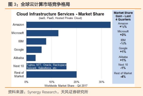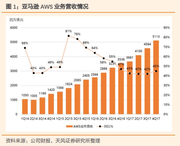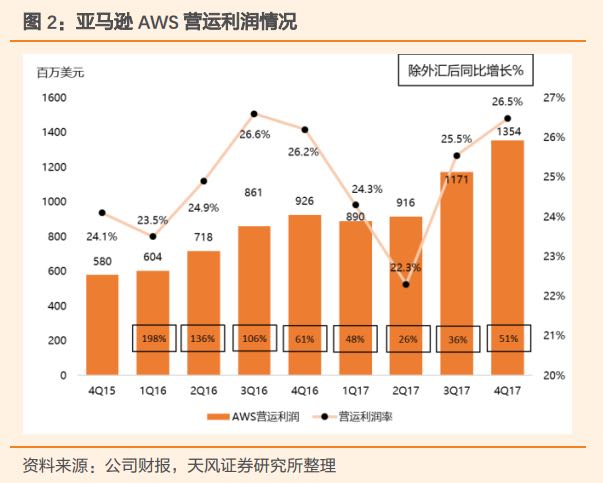 2. 云计算业务:亚马逊是云计算的先驱,在这个市场占据了绝对的领导地位,2017年云计算收入175亿美金左右,并且季度同比增长在40%以上,营运的利润率在20%以上。这一块的市场未来还有很大的成长空间,而作为领导者的亚马逊无论是销售收入还是利润,都有很大 成长的空间。