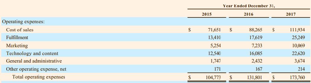2. 从自由现金流看:亚马逊没有产生会计报表意义上的利润,因为他把产生的大量现金流投入到了技术和内容,以扩大其领先优势,构建更深的护城河,从而为股东创造更长期的价值。从下面运营支出表中,我们看到2015年、2016年、2017年技术和内容的支出分别为125亿、161亿和226亿美金,占到销售收入12%左右,这是一个非常惊人的数目。如果把2017年技术和内容支出的一半看成是对未来增长的投入,而不是为了维持现有盈利能力的必须投入,那么这一半也就是110亿美金,加上表2中的84亿美金,大概相当于亚马逊2017年产生的自由现金流194亿美金,对应当前7600亿左右多市值,大约对应39倍左右的自由现金流,不算贵,当然也不便宜。