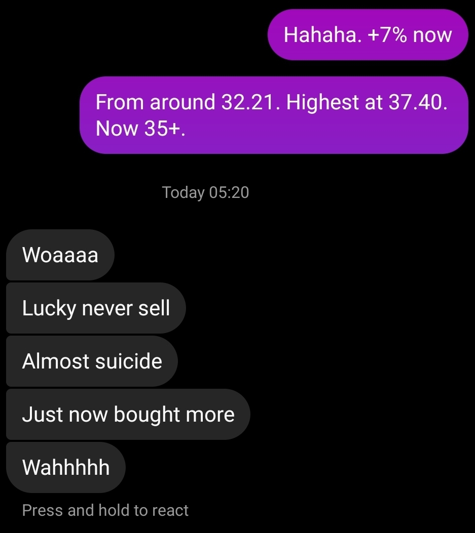 4) Nobody can predict when exactly the price will go up or down. I have concerned friends who have advised me to sell and cut loss at the beginning of the latest wave of short attack. The advice was that I could always use my fund to enter again. But what if the price starts rebounding soon after selling? Why would anyone want to join the enemy to further damage his own stock?
