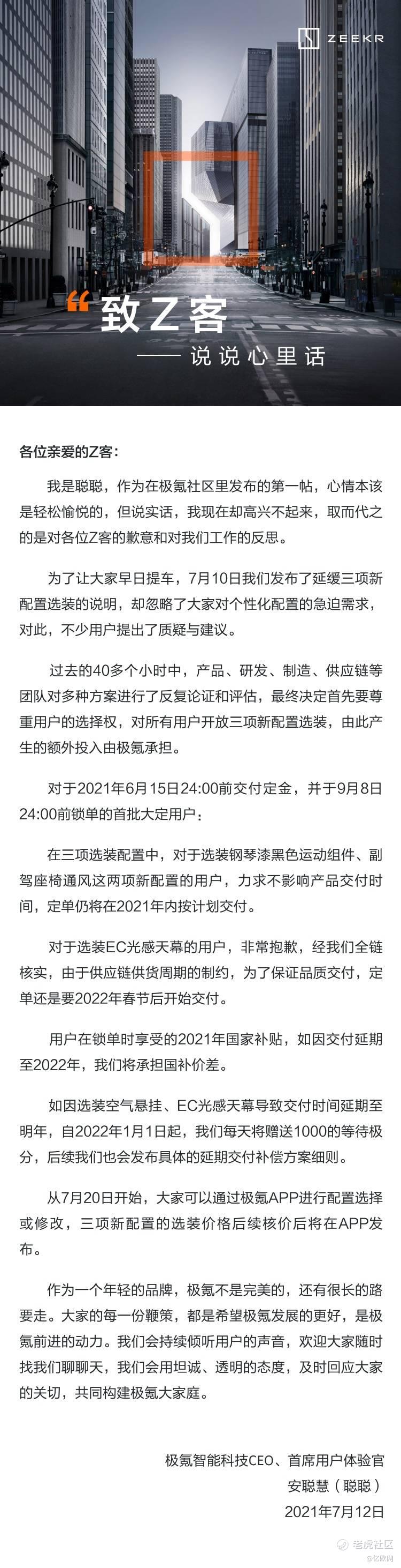 7月12日,极氪CEO、首席用户体验官安聪慧在极氪社区发布“致Z客”的道歉声明。7月14日,微博话题#极氪CEO向车主致歉#登上了热搜。