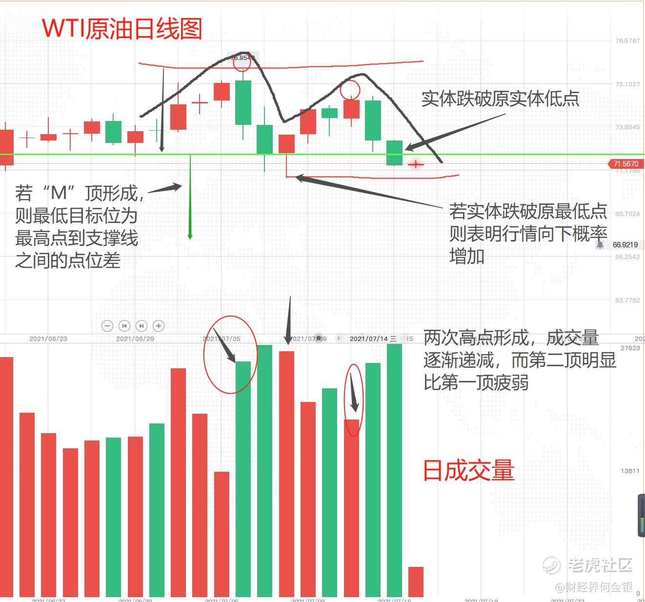 直到本月16号我关注到原油日K线盘面的“M顶"形态,这种形态通常出现在上涨行情顶部,具有底部反转意味,我随即结合技术指标和成交量对原油进行分析,发现原油下跌的可能性在增大(大家请看我16日以来关于”M“顶的文章视频)。通过基本面和技术面相互印证,我更加坚定原油要 下跌,在当时众多人普遍看涨的观点中,我似乎格格不入。。。