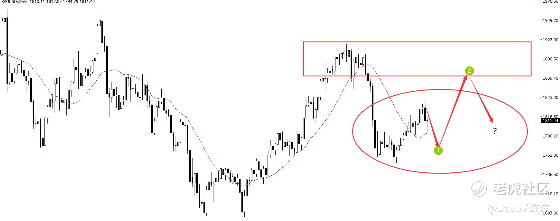 日线级别走势如下图:目前的情绪点是预期着空头下跌趋势,低位的支撑点不知道大家还记不记得非农回探的低点1776一线,所以说这波黄金的情绪性回撤只要破位低位的1788一线,那么低位势必要踩一下非农的低点结构,而在这波日线级别的图中也可以看出,黄金低位到位之后,上方也要给到一波1860一线的到位,而对于后市而言,就要根据后市的k线形态再次跟进,看看是不是要继续反抽,上方给到一波1960附近,再次开启大趋势月线级别的下跌!