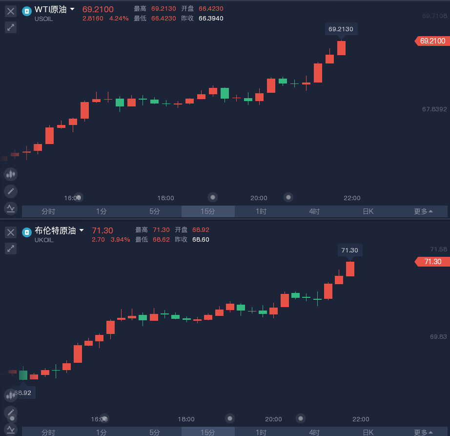 美元回调助长了油价涨势,周三WTI原油午后触底反弹,美盘开盘后持续扩大涨幅,截至发稿,WTI原油收复69美元/桶,日内涨超4%;布伦特原油涨幅也逼近4%。