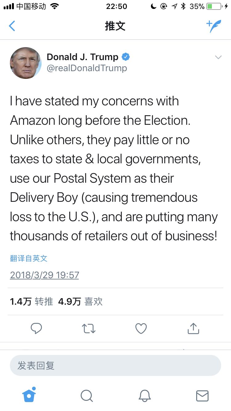 $亚马逊(AMZN)$ 原来亚马逊用Postal System配送货品也是总统不爽的点啊……