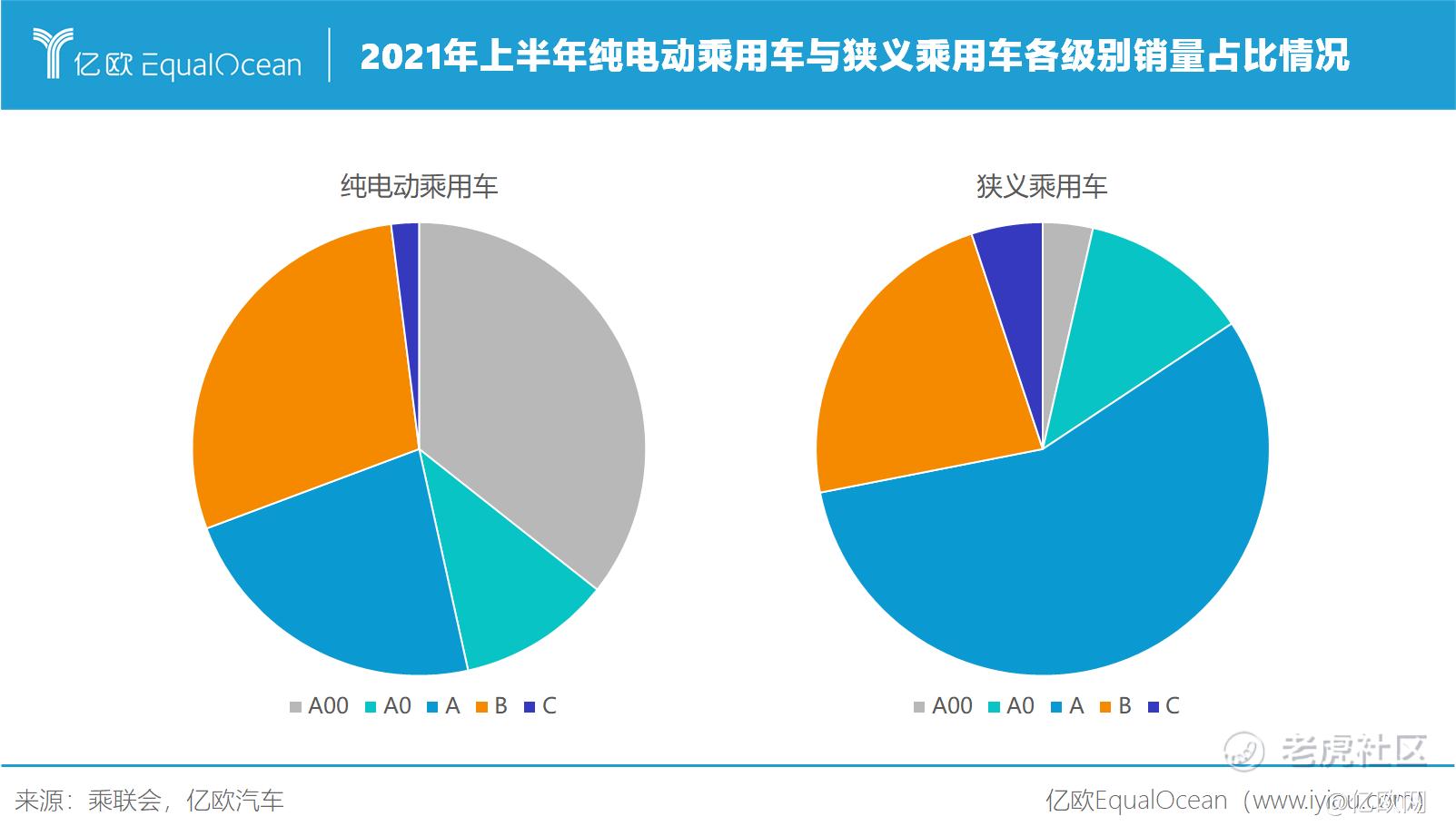 目前,中国纯电动乘用车市场主要由三个级别的车型主导:A00级、A级、B级。2021年上半年,中国A级与B级纯电动乘用车的市场份额总和超过52%,占据了纯电动乘用车半壁江山。