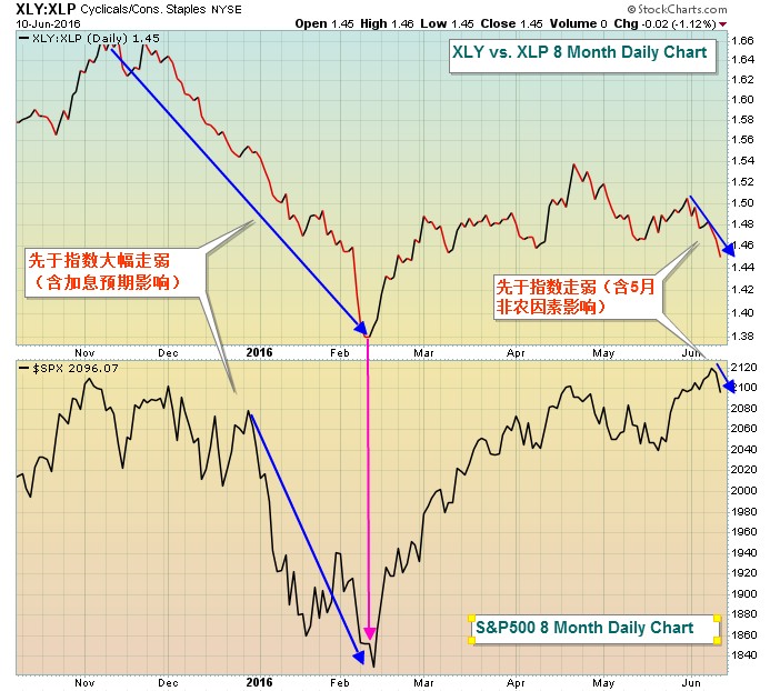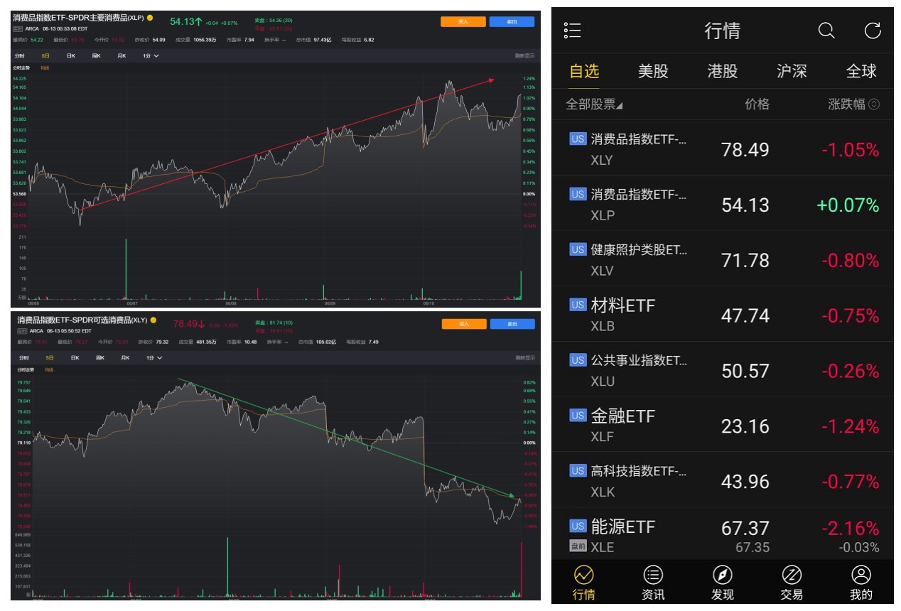所以,XLY更能作为经济的晴雨表,XLP为防御板块,经济数据不好的时候XLP通常伴随着资金流入,参考本月初公布的史上最差的非农数据(5月非农),这种短期利空使XLP在数据公布后随即逆势上涨。就在此理。