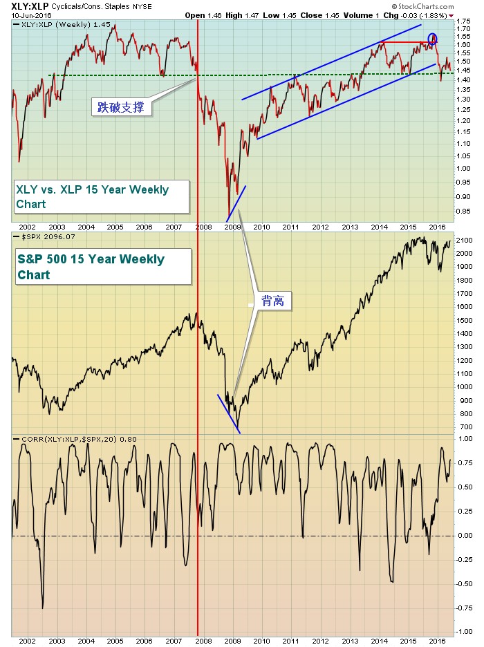 上图所画为XLY和XLP的相对表现情况与标普走势的对比,XLY:XLP在金融危机前就已经跌破主要支撑,并先于指数展开回落,反应的就是资金的避险情绪。