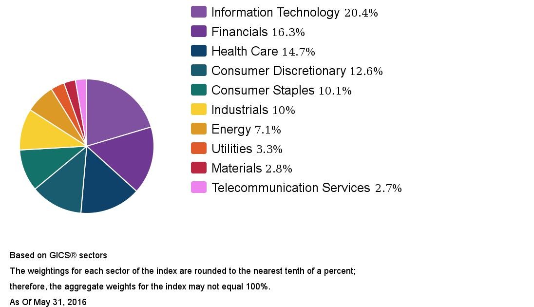 首先,通过S&P 500 Sector Weightings,对指数的构成会有一个更加直观的认识。图片各板块权重占比,统计结果截止于2016.5.31。