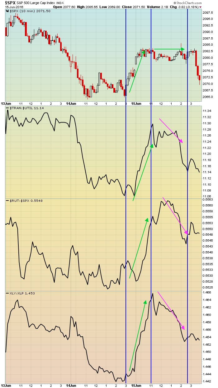 我们从盘中风险板块的相对表现(运输板块VS公共事业板块,罗素VS标普,可选消费品VS必须消费品)可以发现更多的蛛丝马迹,午盘阶段虽然指数在横盘整理,但相应的风险板块的相对表现已开始提前转弱,为尾盘最后半小时的暴跌埋下了伏笔。