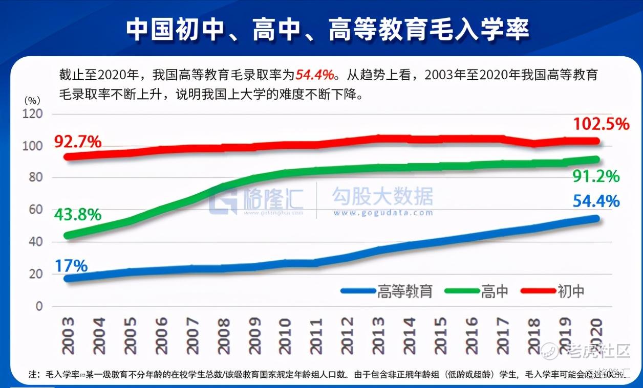 现在,高等教育的毛录取率从2003年提升至了54.4%的水平,而高中入学率超过了9成,未来必然还有更高的录取率,但这不会是那一小部分顶级高校,跟绝大多数普通考生也没关系。