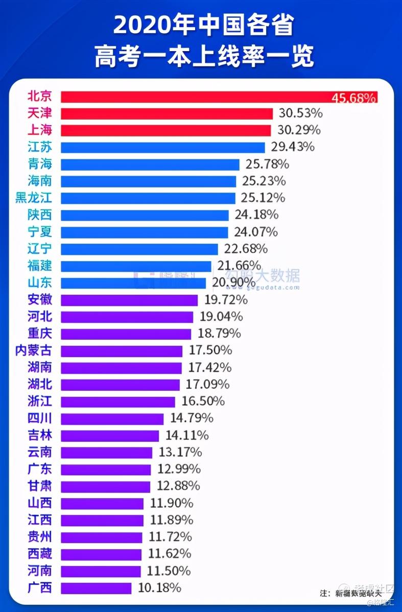 这就是为何2020年全国高考一本线上线率排行中,北京、天津、上海、江苏等省份遥遥领先。相对而言,作为高考大省的河南、广东地区,由于考生量级分母很大,反而一本上线率仅有前者的1/3左右。