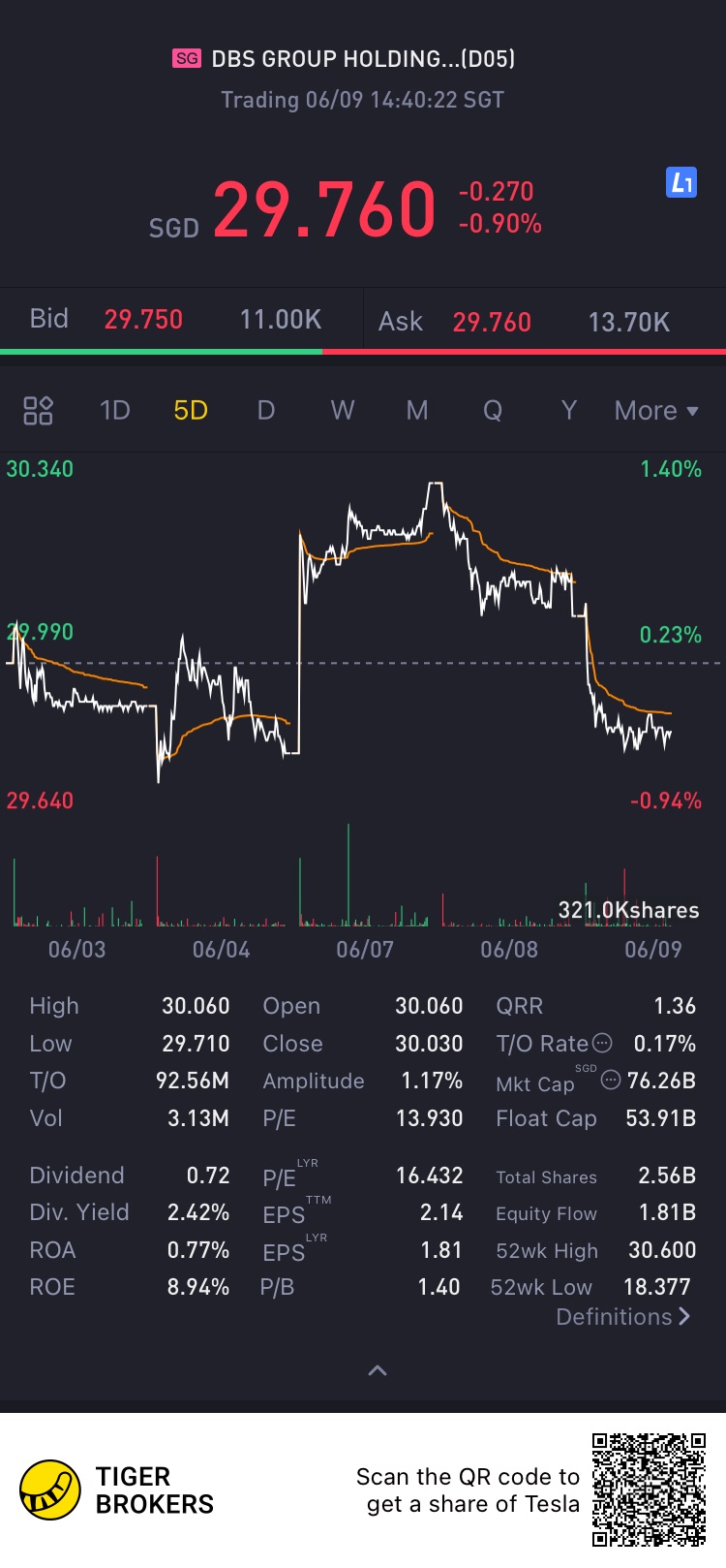 DBS is the largest bank in Singapore, a dip is a good reason to enter.