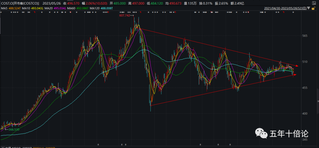 从技术面走势分析,好市多当前处于典型的喇叭口收缩的走势,预计近期将开始向上或者向下突破。技术面短期看多,但是问题的关键是能否突破器压力线。