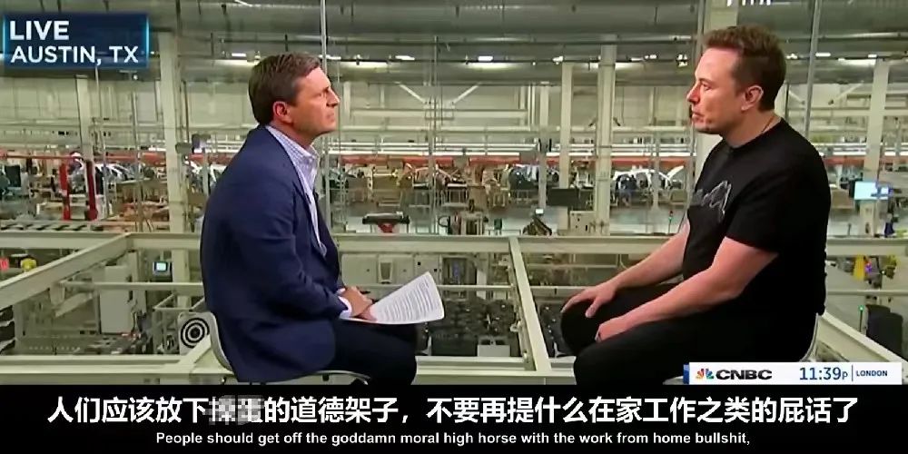 马斯克 是的,这是一个生产力问题,但也是一个道德问题。人们应该放下道德架子,不要再提什么在家工作之类的屁话了。