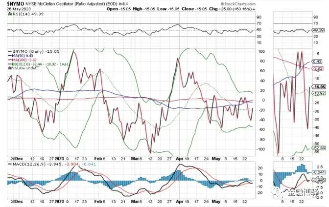 NYMO涨回上布林中线,但还在负值区,MACD还没金叉,RSI也差点。