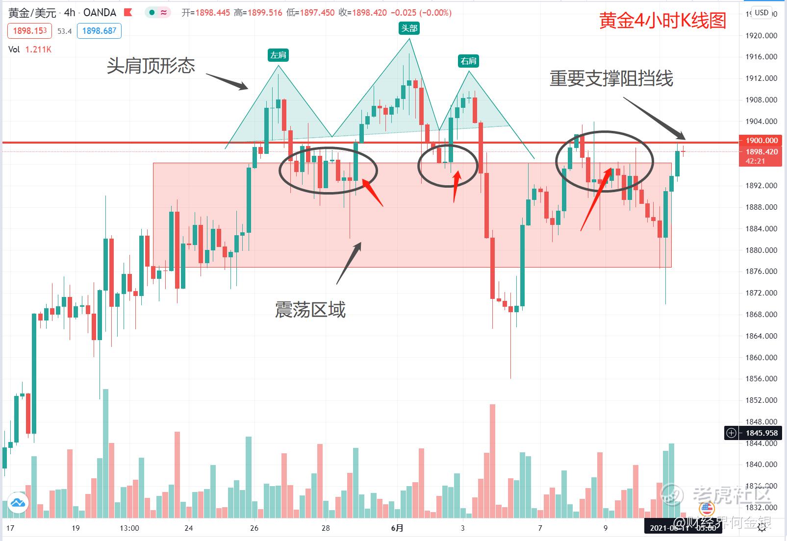 我们再来看黄金4小时盘面,黄金顶部的“头肩顶形态”并未改变,在盘面上还是一个顶部反转信号。而且黄金也并未1900点的重要支撑阻挡点位,我们可以把这个点位看作是黄金的多空分水岭,黄金多次在1880-1900区间来回震荡,此外黄金每次到达高位都未能长时间守住点位,说明黄金多头无力将价格继续抬升,也没有能力将价格守住不往下回落。