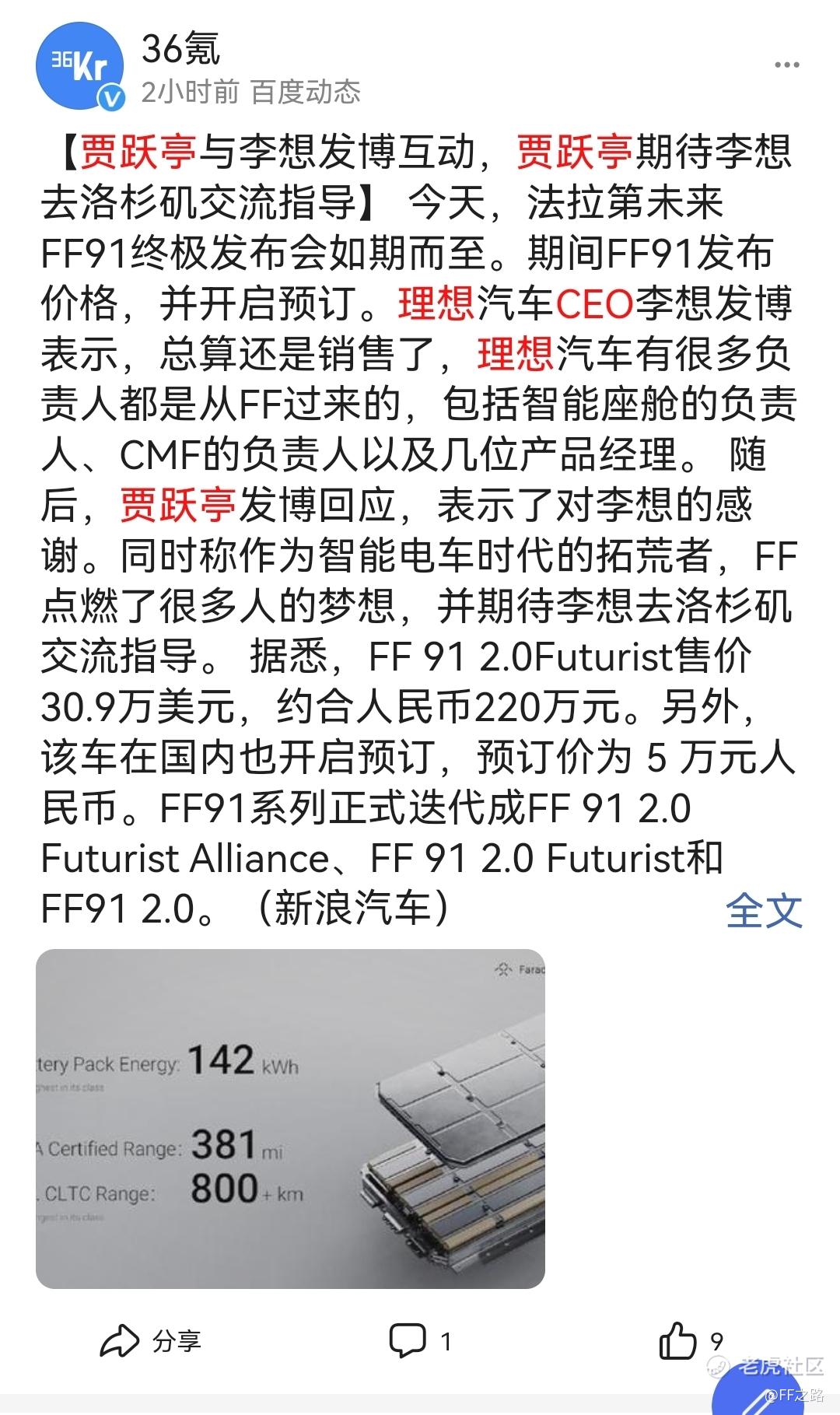 $Faraday Future(FFIE)$ 36氪【贾跃亭与李想发博互动,贾跃亭期待李想去洛杉矶交流指导】 今天,法拉第未来FF91终极发布会如期而至。期间FF91发布价格,并开启预订。理想汽车CEO李想发博表示,总算还是销售了,理想汽车有很多负责人都是从FF过来的,包括智能座舱的负责人、CMF的负责人以及几位产品经理。 随后,贾跃亭发博回应,表示了对李想的感谢。同时称作为智能电车时代的拓荒者,FF点燃了很多人的梦想,并期待李想去洛杉矶交流指导。 据悉,FF 91 2.0Futurist售价30.9万美元,约合人民币220万元。另外,该车在国内也开启预订,预订价为 5 万元人民币。FF91系列正式迭代成FF 91 2.0 Futurist Alliance、FF 91 2.0 Futurist和FF91 2.0。(新浪汽车)