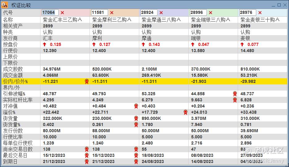 紫金矿业(2899)认购证成交活跃区间一共有6只产品,杠杆在3.9倍至6.4倍,28924及28457实际杠杆相对较高,分别有6.4倍及6.2倍。紫金矿业(2899)认沽证成交活跃区间一共有两只产品,杠杆分别是3.5倍与3.5倍,当中杠杆相对较高产品是12532。需留意,考虑认股证产品除了参考活跃成交区域,同时也要留意产品价外价内幅度,越价外产品其价格敏感度将越低;市况不如预期产品也将会进一步价外,产品价格下跌速度也更快。