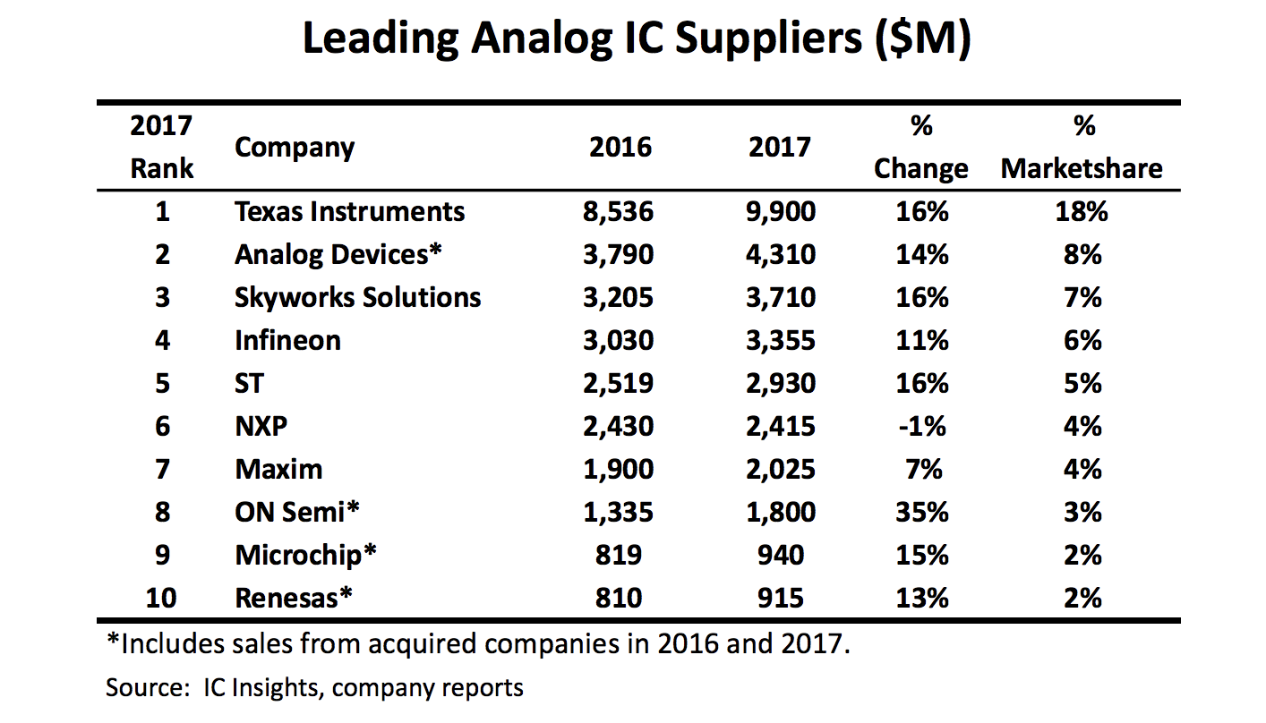 排在第二的公司,ADI在2017年录得了14%的增长。如上图所示,该公司去年模拟IC销售额达43亿美金。图中ADI2016年和2017年的收益数额包含了其在1Q17斥资158亿美金收购了Linear Technology的销售额。