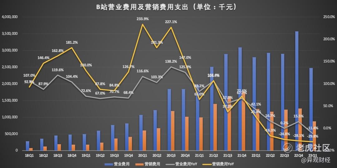 今年第一季度,B站首次出现总运营费用同比、环比双降的情况,披露的数据显示总营业费用为24.8亿元,同比减少11.4%,环比减少30.7%。