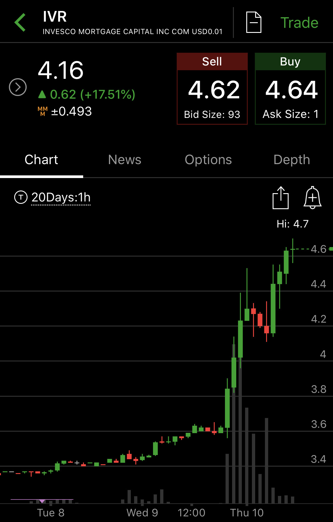 See IVR's jump in today's trading vs. MFA, WMC, and NYMT as well as SPY in the chart below.