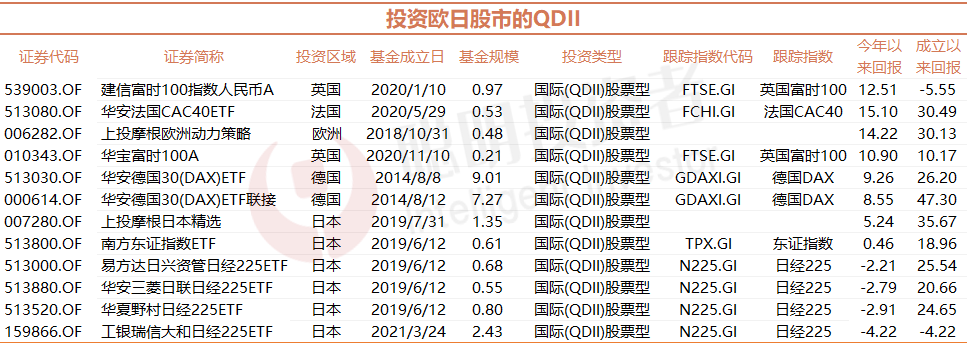 其中,欧洲市场 QDII共6 只,5只单一国家指数基金和 1 只欧洲全市场主动管理型基金;日本 QDII则有 5只指数型与 1 只主动管理型。