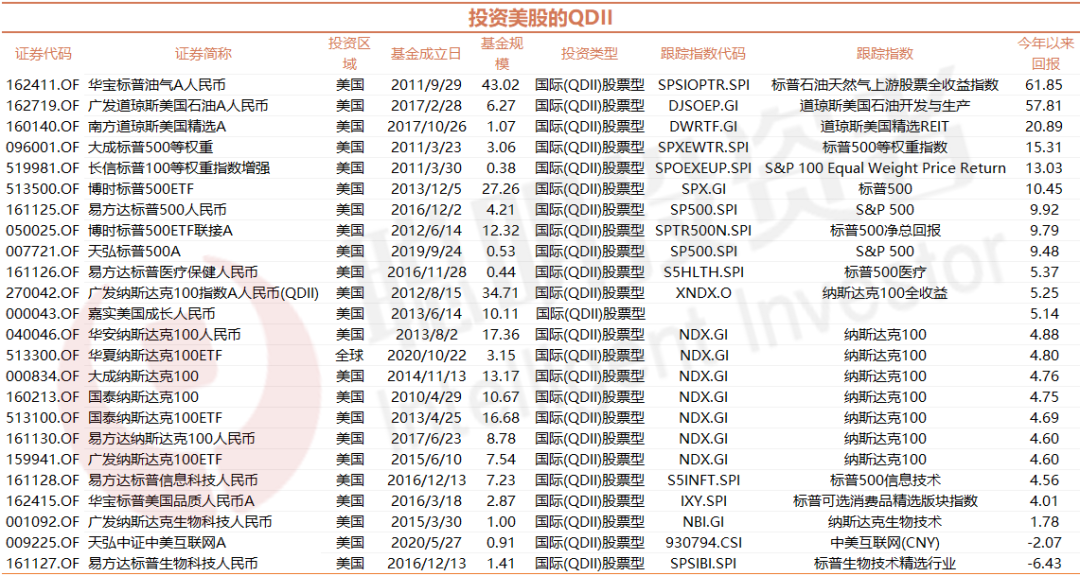 另一只是跟踪【道琼斯美国石油开发与生产】的广发道琼斯美国石油A,该基金今年以来的回报为57.81%,基金规模为6.27亿;