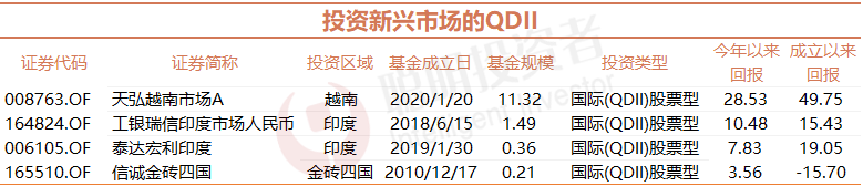 新兴市场 QDII共4只,分别投资于印度、越南和金砖四国,4只均为主动管理型基金。可以看出,今年以来,表现最好的是天弘越南基金,回报28.53%;其次是工银印度基金,回报10.48%。
