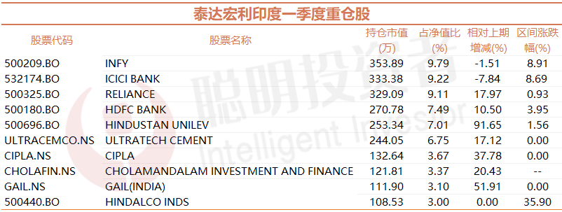 2)、泰达宏利印度是主动管理型 QDII,用于投资印度主题企业的比例不低于非现金资产的 80%,一季报显示,前十大重仓股占比62.51%。