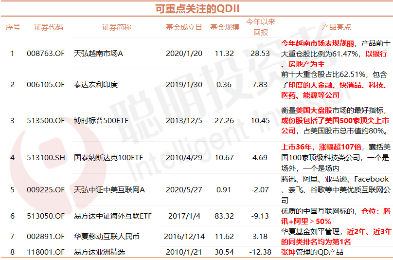 根据以上分析,如果你打算作配置越南,印度这些新兴市场,或想买在海外上市的中国好公司,聪投挑选出8只可重点关注的QD产品: