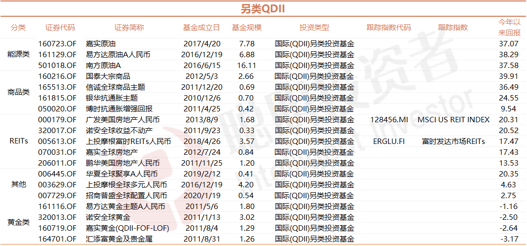 剩下还有一些另类投资的QDII,涵盖了能源、商品、REITs和黄金等,这几类基金,聪投曾在:华宝油气第一重仓股申请破产!股价已下跌超99%!抄底原油基金要分清这一点!关注黄金、房地产QD做过详细分析,感兴趣的同学可以点击查看。