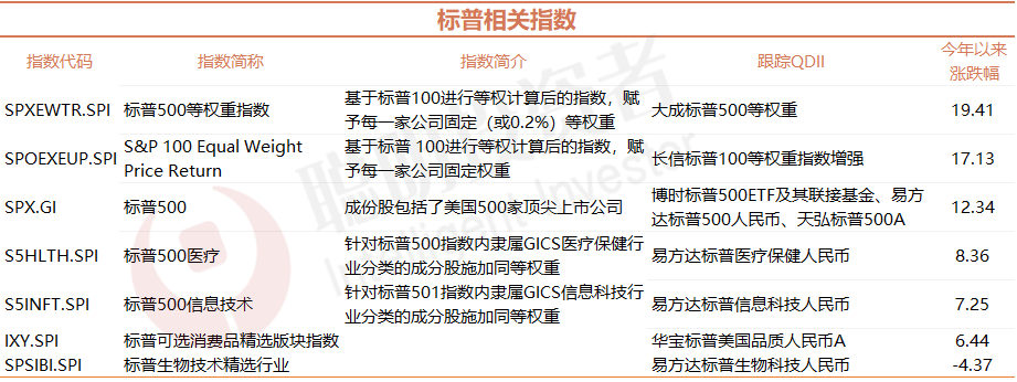 1) 全市场类,包括标普500/100等权重指数、标普500指数。3只指数的差别从名称就可以看出,一个是等权重,一个不是等权重。