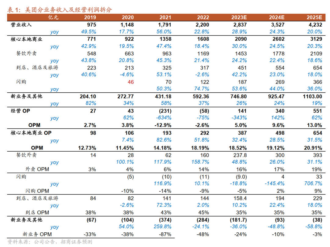 我们认同美团当前加大投入以增强低价及找店心智的举措。心智资产的巩固是长期商业化变现的前提,当前心智及份额的竞争应置于最高优先级。预计美团一系列积极的应对下,其到店GTV将实现高速增长。长期来看,双方模式及定位差异化,在本地生活低用户渗透率及低线上化率的情形下,预计双方共创增量大于存量竞争。总体来看,公司成长性充足,壁垒依然稳固。预计美团核心本地商业分部23E/24E/25E的收入分别为2090/2602/3129亿元,分别同比增长30.0%/24.5%/20.3%。核心本地商业分部的经调整经营OP分别为387/498//654亿元,分别同比增长32.4%/28.5%/31.5%。