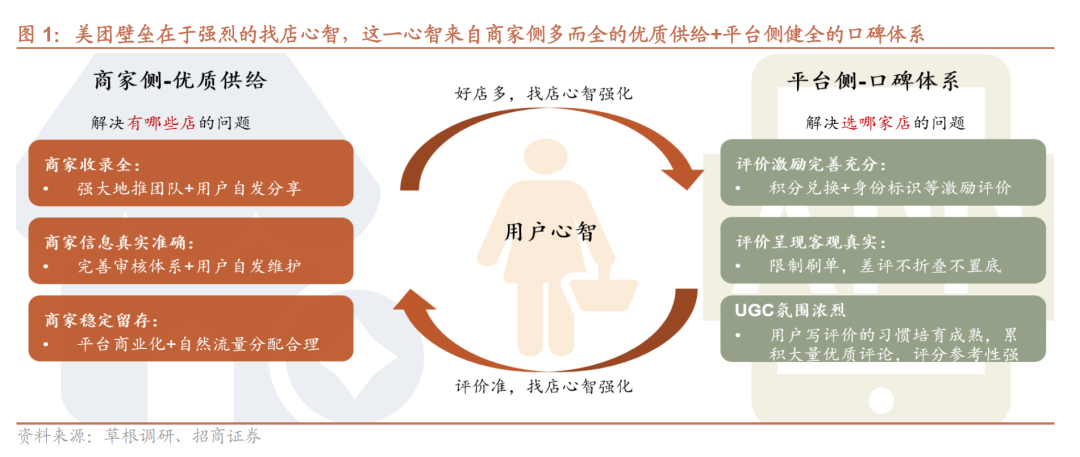 如我们先前报告中论述,美团的壁垒在于稳固的用户找店心智,找店心智则来自商家侧丰富的优质供给+平台侧完善的口碑体系。1)商家侧的优质供给:美团较强的BD实力为平台上拓展了大量商家供给,同时包含了到餐、到综等数百个品类,供给多且全。美团强大的BD团队+用户自发分享维护+平台完善的审核体系+自然流量的合理分配,长期积累形成美团商家收录全、信息真实准确,长效稳定经营的优势; 2)平台侧健全的口碑体系:美团通过评价激励体系完善+呈现机制公正+优质评价积累,养成用户写评价的习惯,形成浓烈的UGC氛围,积累大量优质评价,评分参考性强。
