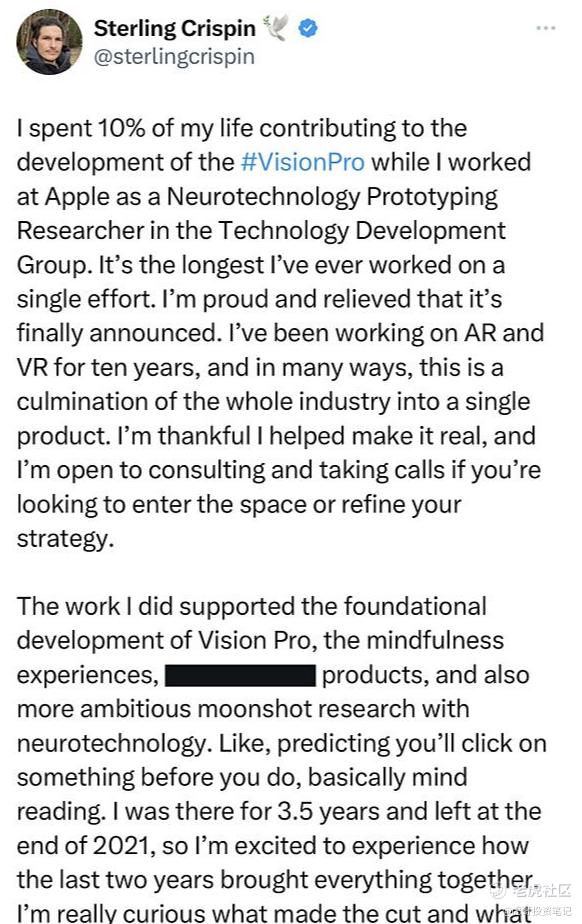 前苹果技术开发组的神经技术原型研究员Sterling Crispin表示,“我所做的工作支持Vision Pro的基础开发、正念识别、以及更雄心勃勃的神经技术登月研究。就像预测你会在你电极某些东西之前电极,基本上是读心术……通过追踪用户的眼睛行为,并实时重新设计UI以创建更多这种预期的瞳孔反应,从而创建用户大脑的生物反馈。这是一个通过用户眼睛进行的粗糙脑机接口,但非常酷。”——所以说,vision Pro不仅仅能通过眼手配合实现操作,不动手,光靠眼睛也能操作。