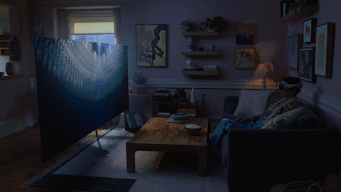 第二,MR设备的娱乐与智能手机一样,不影响与现实的交互。手机放下就能做其它事情,VR设备还得“穿脱”,Vision Pro与现实交互则不存在障碍——有人靠近,基于Eyesight能直接“透视”,眼神交流;转动数码旋钮,就能调整沉浸度,随意切换现实与虚拟世界。