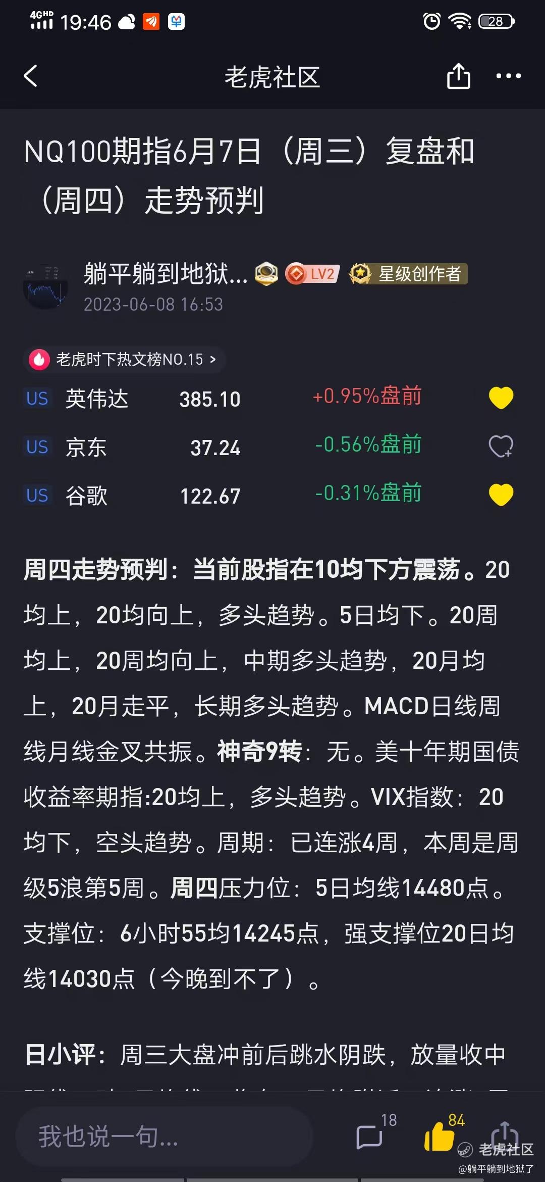 日小评:周五大盘探底回升。复盘看走势,完全是按规定动作走,连涨4周一根中阴第二天几乎反包,强势特征明显。回踩十日线技术调整完毕,大概率不回回踩20均了。看来这波调整用了1天多一点低点探完了,下步个人认为横盘振荡或直接上攻大概率,周四低点应该破不了了。但如果是对连涨4周的一个调整大盘不会急于上攻,如果不是直接上攻的话,因为调整时间短走不高。近段大盘沿5日均拾阶而上,坚韧稳重、干净利索,足见强势。涨势确定,很难再受大的干扰,相反生命线上每次回调都是入场机会,小调小机会、大调大机会。(个人把20均线当作短线生命线,把5日均线当作超短生命线,生命线有效跌破要减仓或清仓,重新站上再接回。)周线级别前高15268.75点不远的将来能到。日内超短入场时机:小时K线5时、10时、20时均粘合时。日内超短离场时机:小时均线高位远离20时均5时均走平或有效跌破5日均时。近期总的观点:人工智能革命,冲散了所有利空,NQ持续牛牛牛。世界智能化的进程,也是科学技术持续解放和发展生产力的过程,世界的智能化变革会持续推动NQ的。技术上看:5月份收涨7.23%,20月均上,MACD月线金叉,NQ长期多头趋势。从纳指历史牛市走势看:慢牛指数大部分时间沿5周均线上行,即5周均为支撑位,振幅收窄、情绪稳定、上涨确定、小步慢走,一般调整在盘中或日间完成,上涨时间长了或加速上行时来个周线级别的调整,5周均线生命线,越靠近越低吸,有效跌破止损离场,站上再接回仓位。股市走牛底气:Chatgpt横空出世,人工智能划时代变革拉开帷幕,世界智能化的进程刚刚开始,人类将步入智能化的新阶段,管理世界能力水平将大大提升,应对风险能力将显著增强,社会生产力将大大提高,世界和平和发展将更稳固,科技经济将更加繁荣。投资市场也更加健康繁荣稳定。看好NQ中长期的走势。