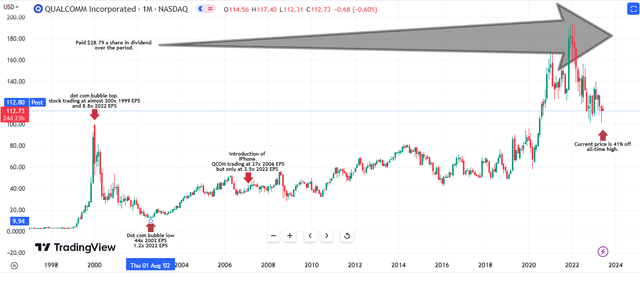 这张图表很好地总结了前面提出的要点。投资者本可以选择高通互联网泡沫的绝对顶端,并且今天仍然赚了一些钱。那么,如果他们等待泡沫破裂呢?从技术上讲,它从来没有,在互联网泡沫低点时的估值是 44 倍市盈率。尽管如此,该股在近 21 年内增长了 10 倍,不包括股息的复合回报率为 11.6%。这个故事的士气是投资者会很好地购买好企业并坚持下去。这是因为 2002 年的收益基于与 2010 年代完全不同的业务。这些数字根本没有可比性。这就是 英伟达的故事与高通的故事有一些相似之处的地方。