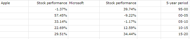 您可以在表中看到,从 1995 年到 2005 年,苹果 的表现不及微软,之后的 10 年期间占据主导地位,而微软在 2020 年结束的五年期间表现更好。