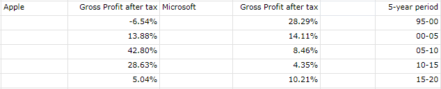 这张表比较了苹果和微软从 1995 年到 2020 年五年内税后毛利的平均增长率。选择税后毛利是因为它向我们展示了每家公司为投资者创造的收益,并剔除了任何差异投资强度或资本结构。它纯粹是企业通过销售其商品和服务所产生的结果。