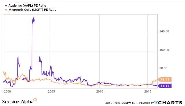 就分析师个人而言,不认为微软的股票在互联网时代的余波中苦苦挣扎,因为它必然达到极高的估值,而是因为该公司错过了智能手机、电子商务和搜索等重要的商业趋势。与此同时,尽管 苹果 在 2000 年代初的估值相对较高,但它仍然蓬勃发展,因为它通过推出 iPhone、iPad 及其服务业务来开发 iPod。