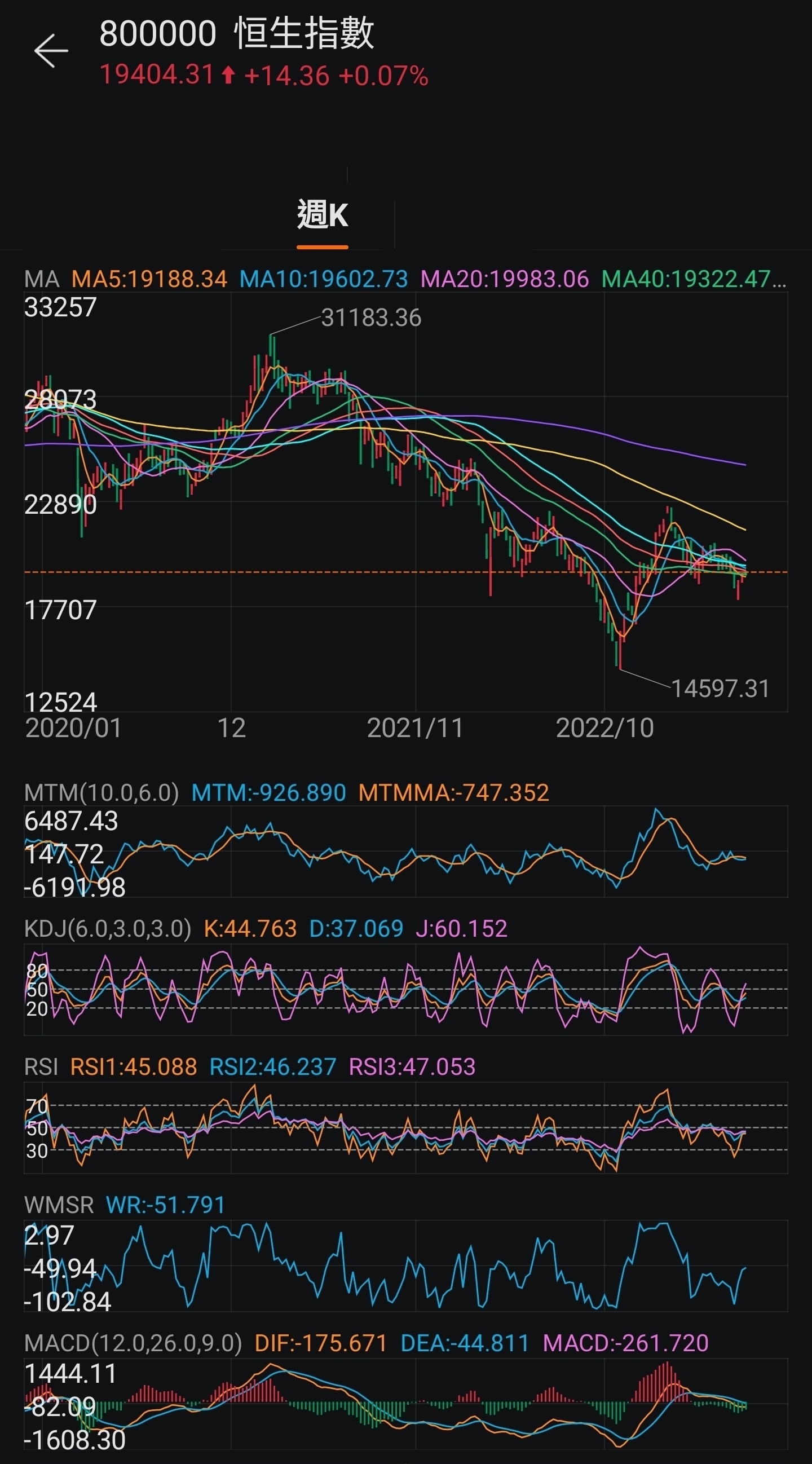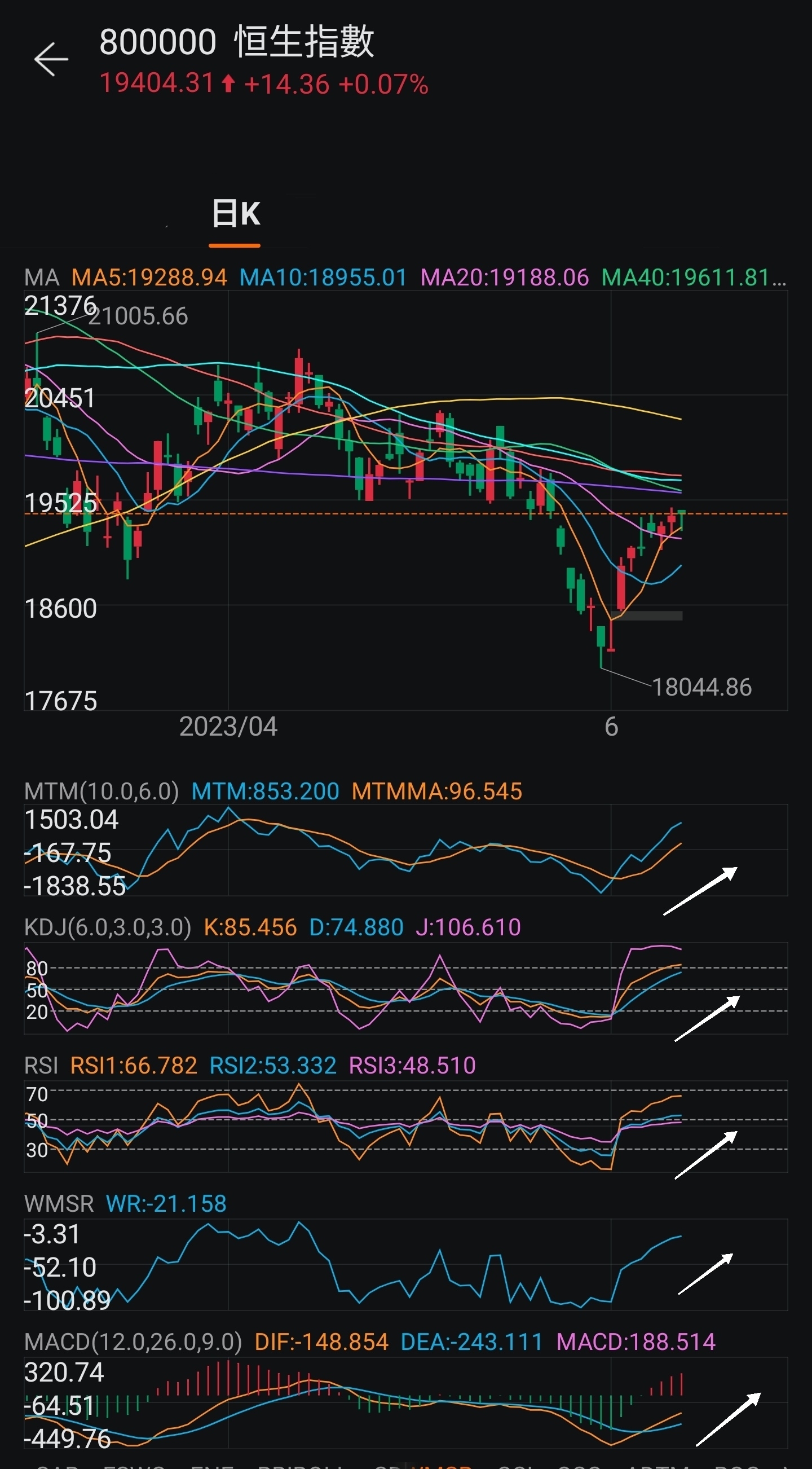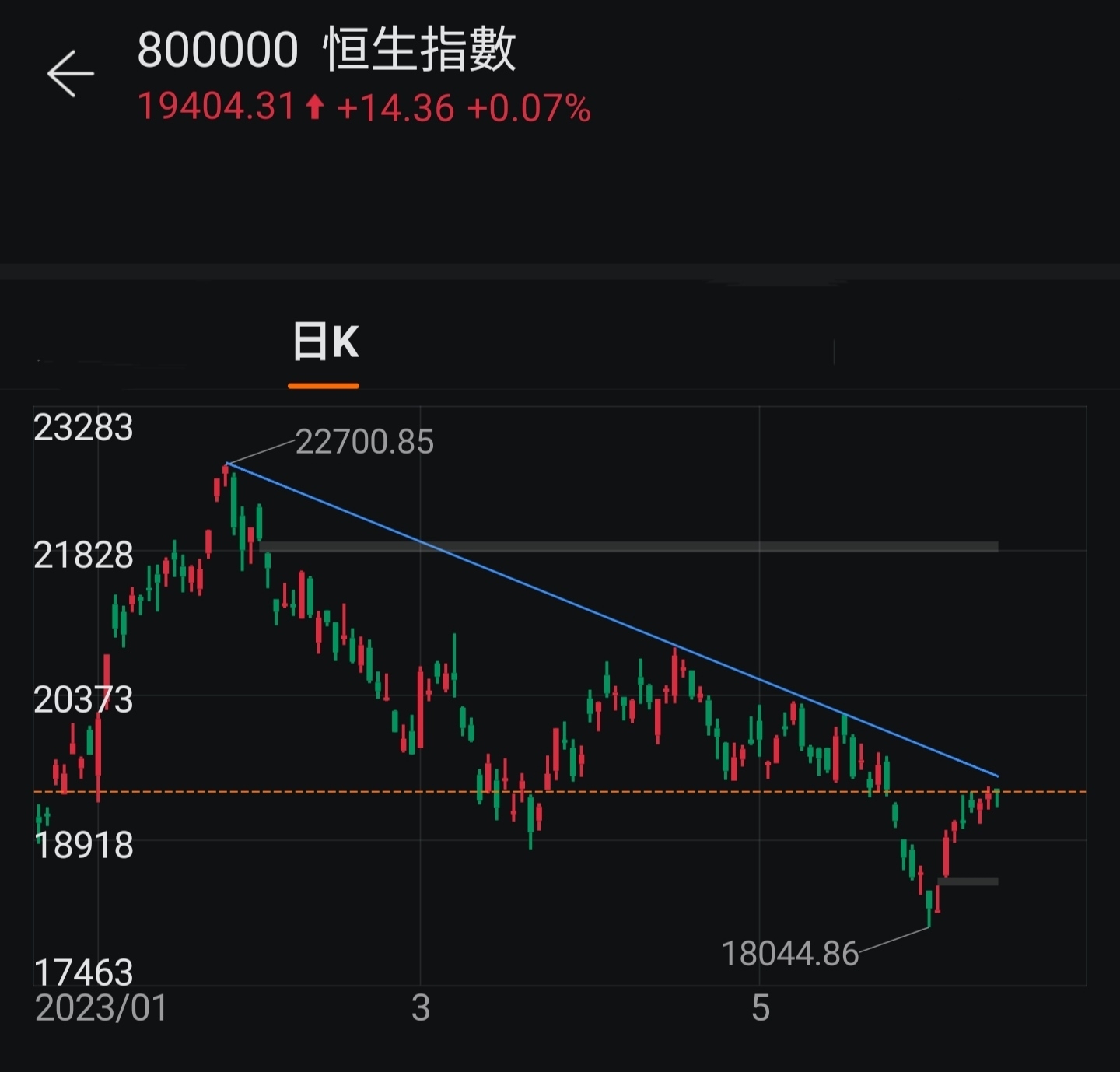 从K线日线图看到恒生指数正受制于一个下降轨,下降轨底部约19540点。恒生指数能否升穿此下降轨呢?